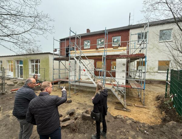 Bürgermeister Thomas Orlowski hat sich in dieser Woche den Rohbau des Anbaus der Kindertageseinrichtung Kleine Strolche in Bork angeschaut. Gemeinsam mit der Projektverantwortlichen Heike Klee ließ er sich von Bauleiter Ali Kartal von Benthaus Architekten den Baufortschritt erläutern. In Hassel wurde die bestehende Tageseinrichtung auf vier Gruppen ergänzt. Da die vorhandenen Räume dafür nicht ausreichend waren, ist der Anbau notwendig geworden.