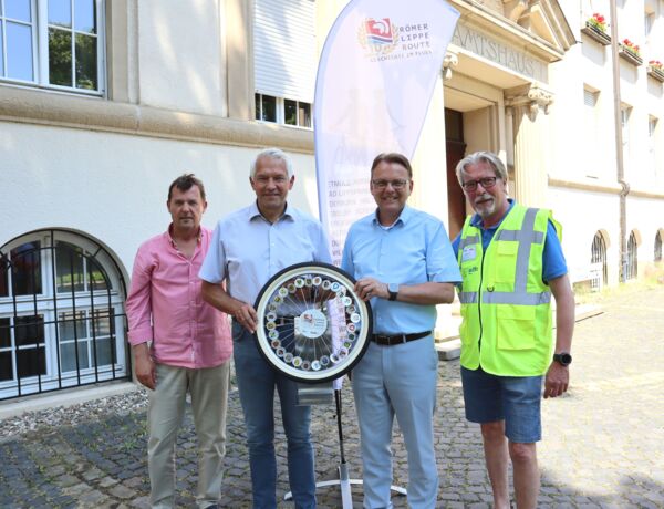 Die Lippe ist nicht nur der längste Fluss in Nordrhein-Westfalen sondern auch Namensgeber für einen der schönsten Radwege der Region: der Römer-Lippe-Route. Auf mehr als 400 Kilometern können Fahrradbegeisterte Römerkultur und Wassererlebnis zwischen Detmold und Xanten bequem vom Sattel aus erleben. Auch Selm ist mit dem Ortsteil Bork ein Bestandteil der Römer-Lippe-Route. In diesem Jahr feiert die Route ihr zehnjähriges Bestehen. Seit April bis in den Oktober werden in den Anrainerkommunen Jubiläumswochen gefeiert. Start war Anfang April in Sonsbeck. Vom 16. Juni bis 22. Juni ist Selm Schirmherr der Jubiläumswochen. Als sichtbares Zeichen übergab nun Olfens Bürgermeister Wilhelm Sendermann das Römer-Lippe-Routen-Rad als Staffelstab an Selms Bürgermeister Thomas Orlowski. Anschließend wird das Rad von Selm an die Nachbarstadt Waltrop übergeben.