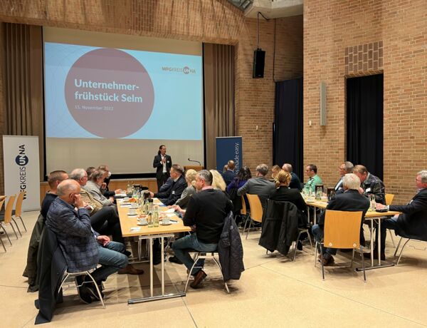 25 Unternehmerinnen und Unternehmer waren jetzt der Einladung der Wirtschaftsförderungsgesellschaft für den Kreis Unna mbH (WFG) und der Stadt Selm gefolgt und nahmen am 11. Unternehmerfrühstück im Großen Saal des Bürgerhauses Selm teil.