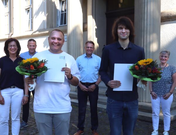 Ihre Ausbildung zum Verwaltungsfachangestellten haben nun Robin Focke und Steffen Kohl erfolgreich bei der Stadtverwaltung Selm beendet. Dafür bekamen sie Glückwünsche unter anderem von Bürgermeister Thomas Orlowski. „Ich freue mich, dass Sie die Ausbildung erfolgreich abgeschlossen haben und weiter im Team der Stadtverwaltung Selm arbeiten“, so Thomas Orlowski. Robin Fockes erste Station nach bestandener Ausbildung sind die Zentralen Dienste. Steffen Kohl ist im Stadtamt 65 bei den Liegenschaften eingesetzt. Auch Personaldezernentin Jutta Röttger, Personalrat Brigitte Althoff-Rörig und Ausbildungsleiter Falk Blaschke gratulierten den ehemaligen Auszubildenden.