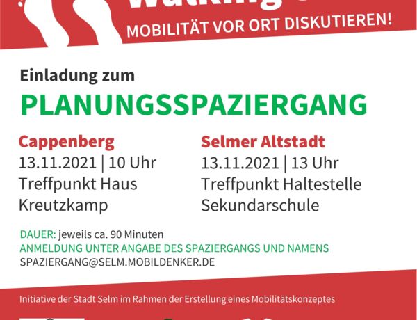 Das integrierte Mobilitätskonzept der Stadt Selm geht in die nächste Runde. Nach den erfolgreichen Planungsspaziergängen mit Kindern aus der Overbergschule und den Spaziergängen mit Erwachsenen in Bork, folgen nun weitere. Die nächsten Wanderungen zum Mobilitätskonzept finden am 13.11.21 um 10 Uhr in Cappenberg (Treffpunkt Haus Kreutzkamp) und um 13 Uhr in der Selmer Altstadt (Treffpunkt Haltestelle Sekundarschule) statt.