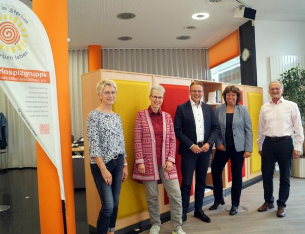 Bürgermeister Thomas Orlowski und Beigeordnete Sylvia Engemann haben der Hospizgruppe Selm-Olfen-Nordkirchen einen Besuch in ihren neuen Räumlichkeiten an der Kreisstraße abgestattet. Seit dem 1. Juni 2021 ist die Hospizgruppe in den Räumen der ehemaligen Sparkassen-Filiale an der Kreisstraße. „Die neuen Räume sind optimal und vor allem für alle besser zu erreichen“, freut sich die 1. Vorsitzende der Hospizgruppe, Dr. Antje Münzenmaier.