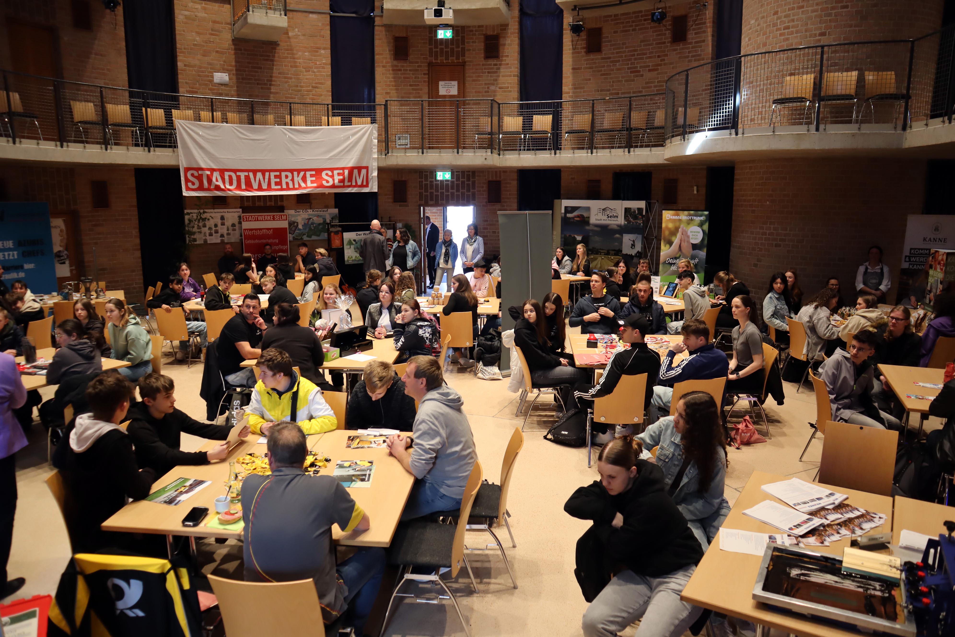 220 Schülerinnen und Schüler des neunten Jahrgangs des Städtischen Gymnasiums und der Selma-Lagerlöf-Sekundarschule sowie des achten Jahrgangs des Förderzentrums Nord hatten bei der 6. Selmer Azubinale im Bürgerhaus nun die Chance, etwas über verschiedene Ausbildungsplätze kennen zu lernen. Die Bandbreite der anwesenden Unternehmen war groß: Bäckereien, Banken, Stadtwerke Selm oder Stadtverwaltung Selm. Damit jeder Schüler gleich mehrere Stationen durchlaufen konnte, wurde nach 20 Minuten gewechselt.