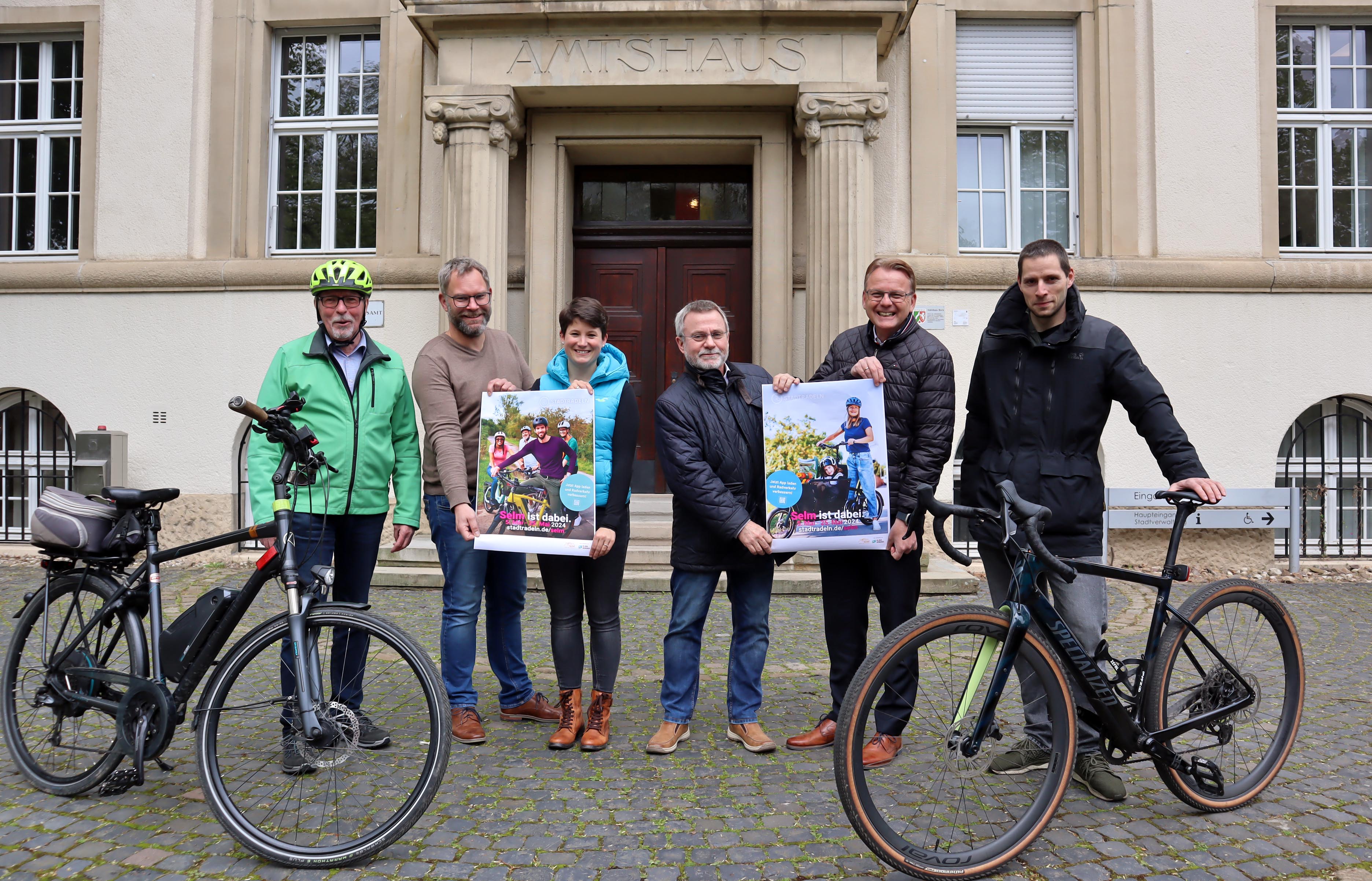 Freuen sich auf die Aktion STADTRADELN 2024 und rufen zur Teilnahme gemeinsam auf: Peter Cortner (v.l. / ADFC Selm), David Ruschenbaum (Stadtmarketing), Klimaschutzmanagerin Britta Purfürst, Udo Tubbesing (ADFC Selm), Bürgermeister Thomas Orlowski und STADTRADEL-Star Jörn Schwering.