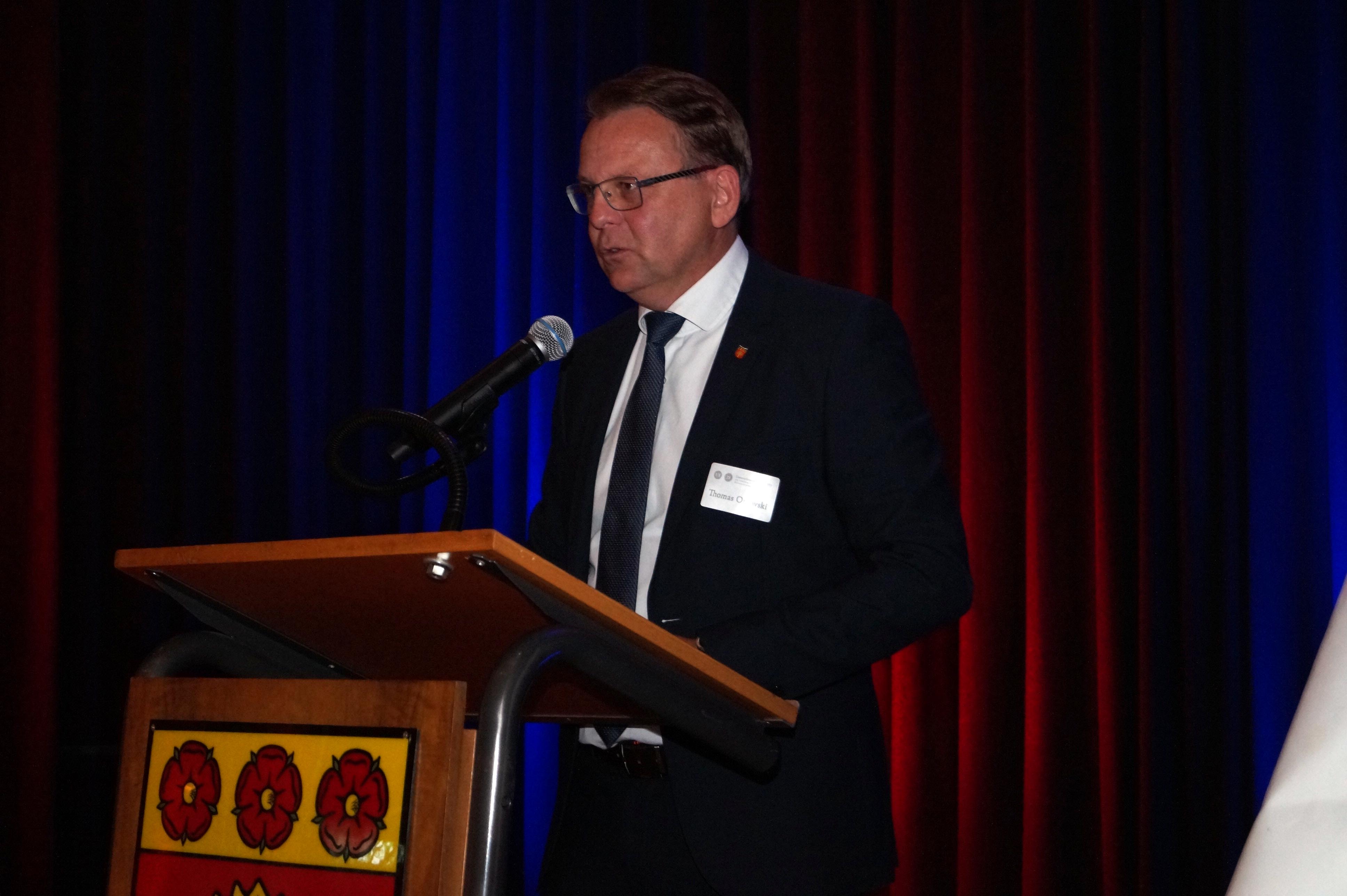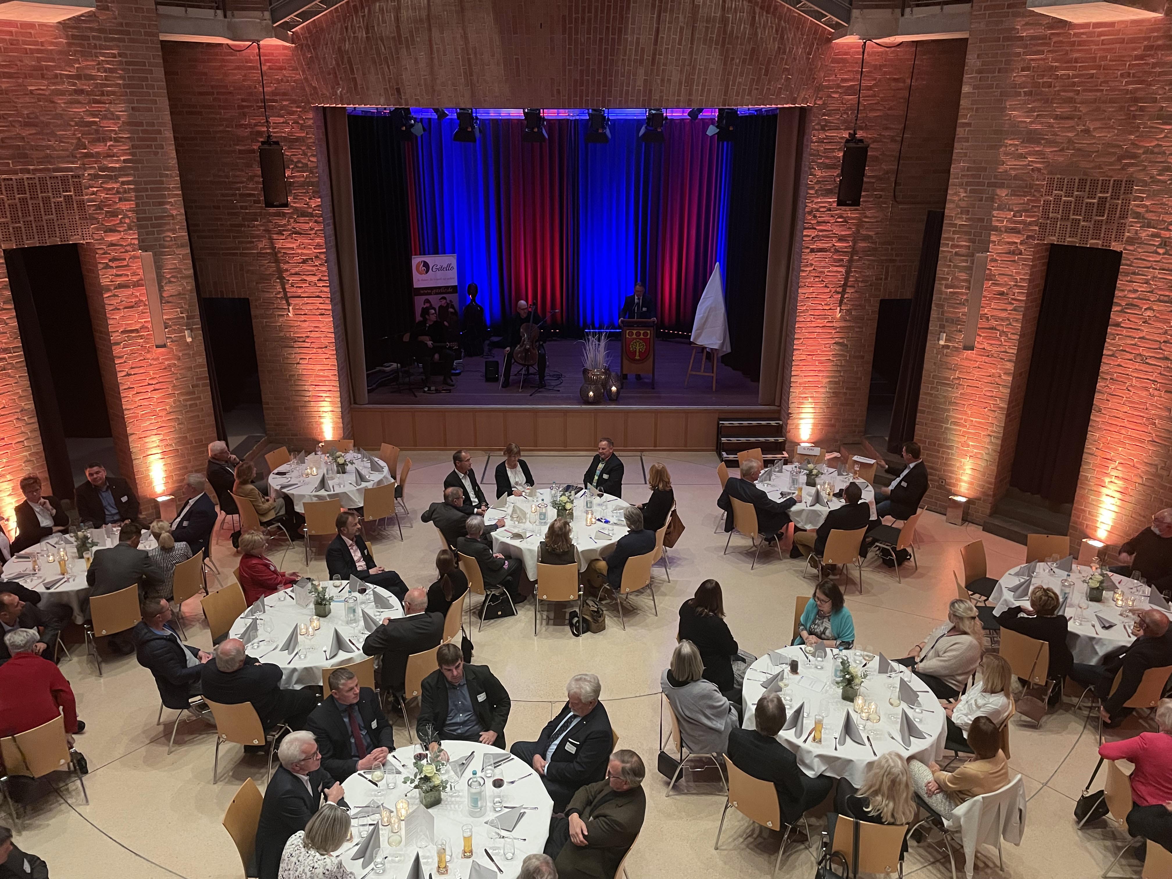 Über 100 Gäste kamen unter Einhaltung der 3G-Regel ins Bürgerhaus und durften sich überraschen lassen, wer diesmal Preisträger wird. Eine Jury hatte aus zahlreichen Vorschlägen den Gewinner ermittelt. Bürgermeister Thomas Orlowski freute sich, dass nach der ausgefallenen Preisverleihung im vergangenen Jahr nun die Veranstaltung stattfinden konnte. „Wirtschaftlich geht es der Stadt gut. Wir haben starke Unternehmen, die sich hier neu ansiedeln oder, wie im Fall von McAirlaids oder Saria, expandieren wollen. An diese positive Entwicklung wollen wir anknüpfen“, erklärte er in seiner Begrüßung.