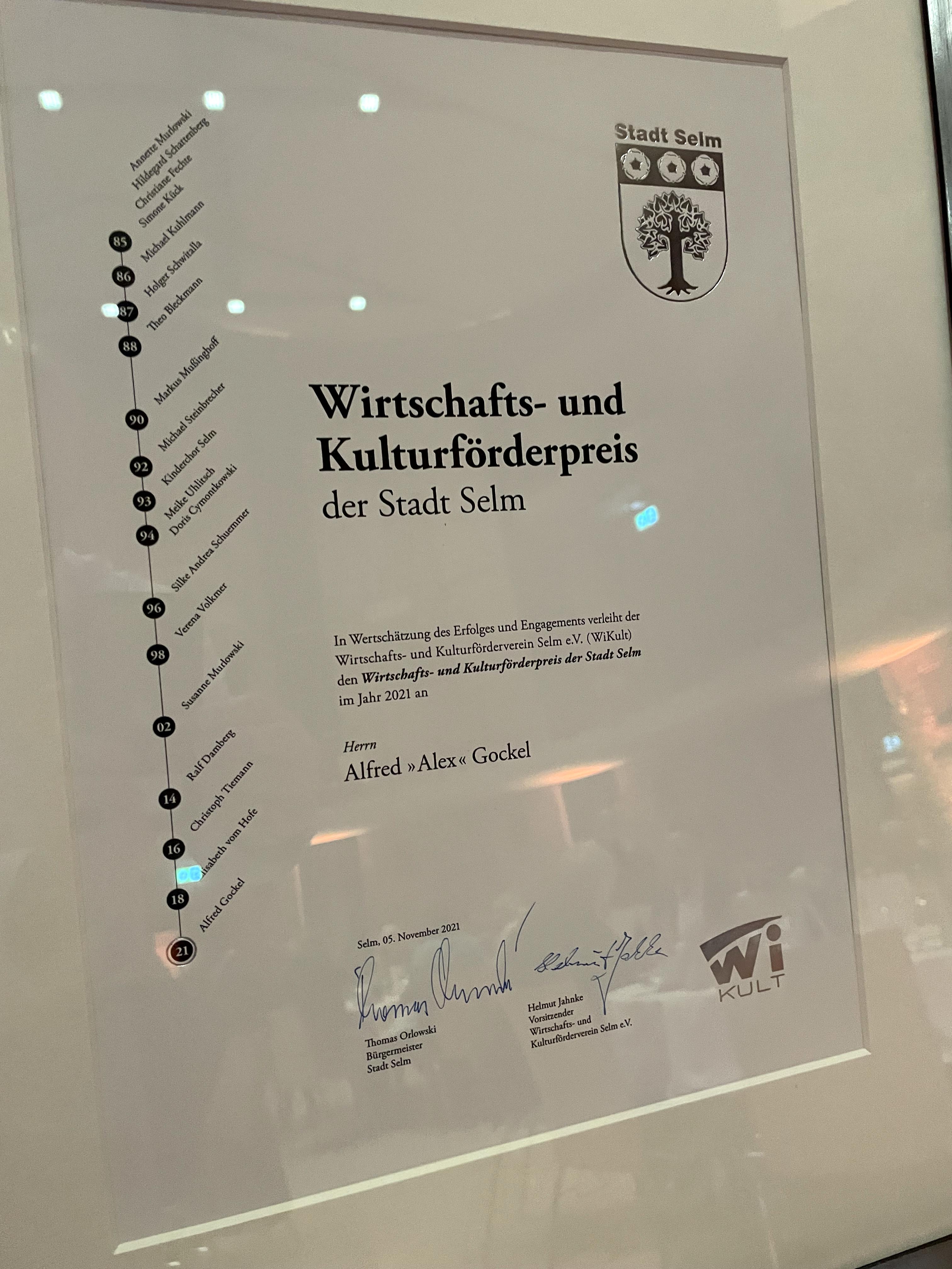 Seine Heimat ist Selm und auch wenn er heute in der ganzen Welt unterwegs ist, hängt sein Herz noch immer an seiner Heimatstadt. Alfred „Alex“ Gockel ist der neue Kulturpreisträger der Stadt Selm. Am Freitag wurde dem Künstler im Bürgerhaus der Wirtschafts- und Kulturförderpreis verliehen. Dieser Preis wird traditionell alle zwei Jahre von Stadt Selm und dem Wirtschafts- und Kulturförderverein vergeben.