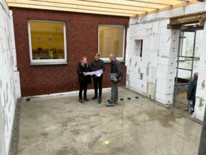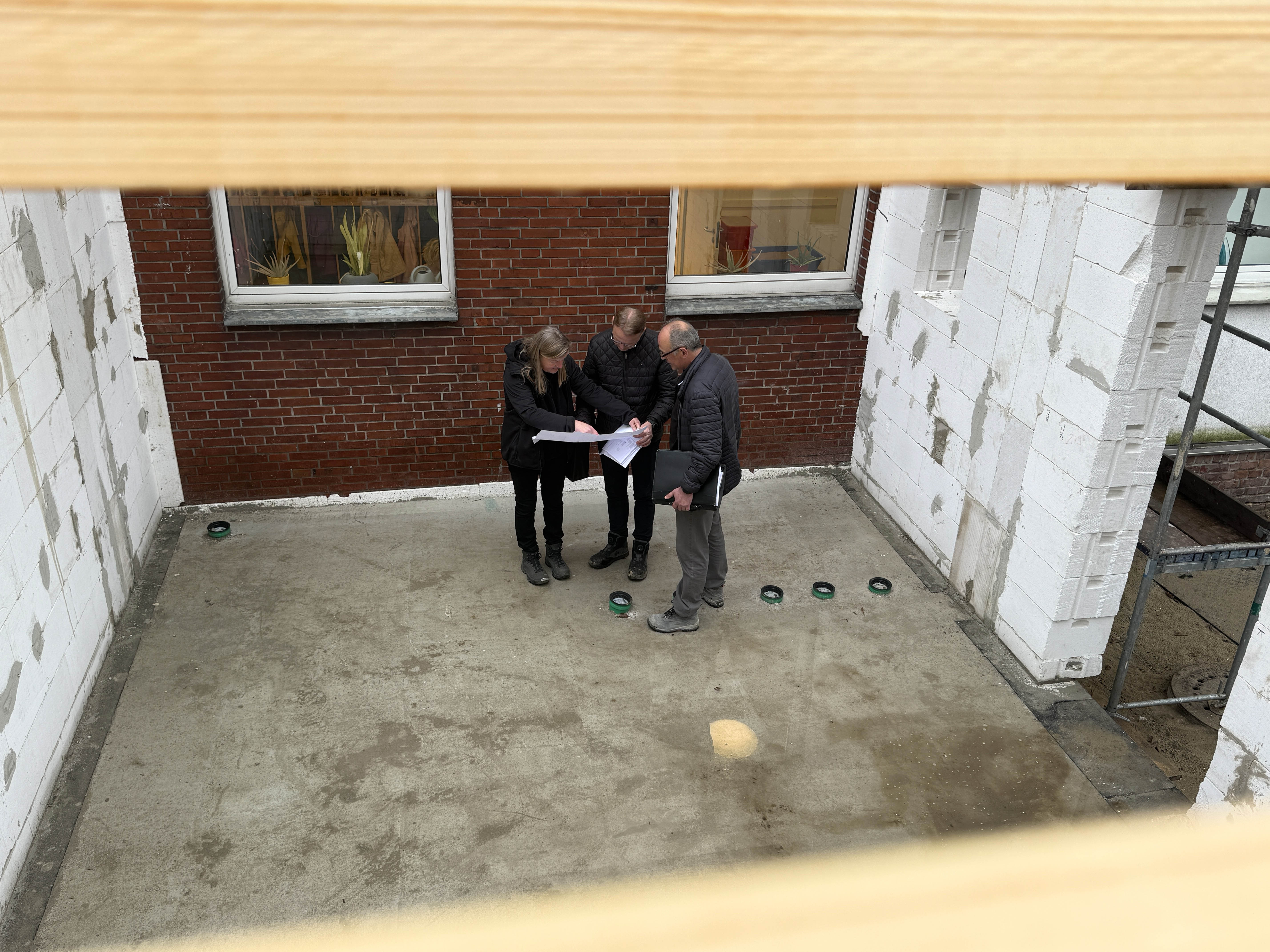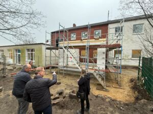 Bürgermeister Thomas Orlowski hat sich in dieser Woche den Rohbau des Anbaus der Kindertageseinrichtung Kleine Strolche in Bork angeschaut. Gemeinsam mit der Projektverantwortlichen Heike Klee ließ er sich von Bauleiter Ali Kartal von Benthaus Architekten den Baufortschritt erläutern. In Hassel wurde die bestehende Tageseinrichtung auf vier Gruppen ergänzt. Da die vorhandenen Räume dafür nicht ausreichend waren, ist der Anbau notwendig geworden.