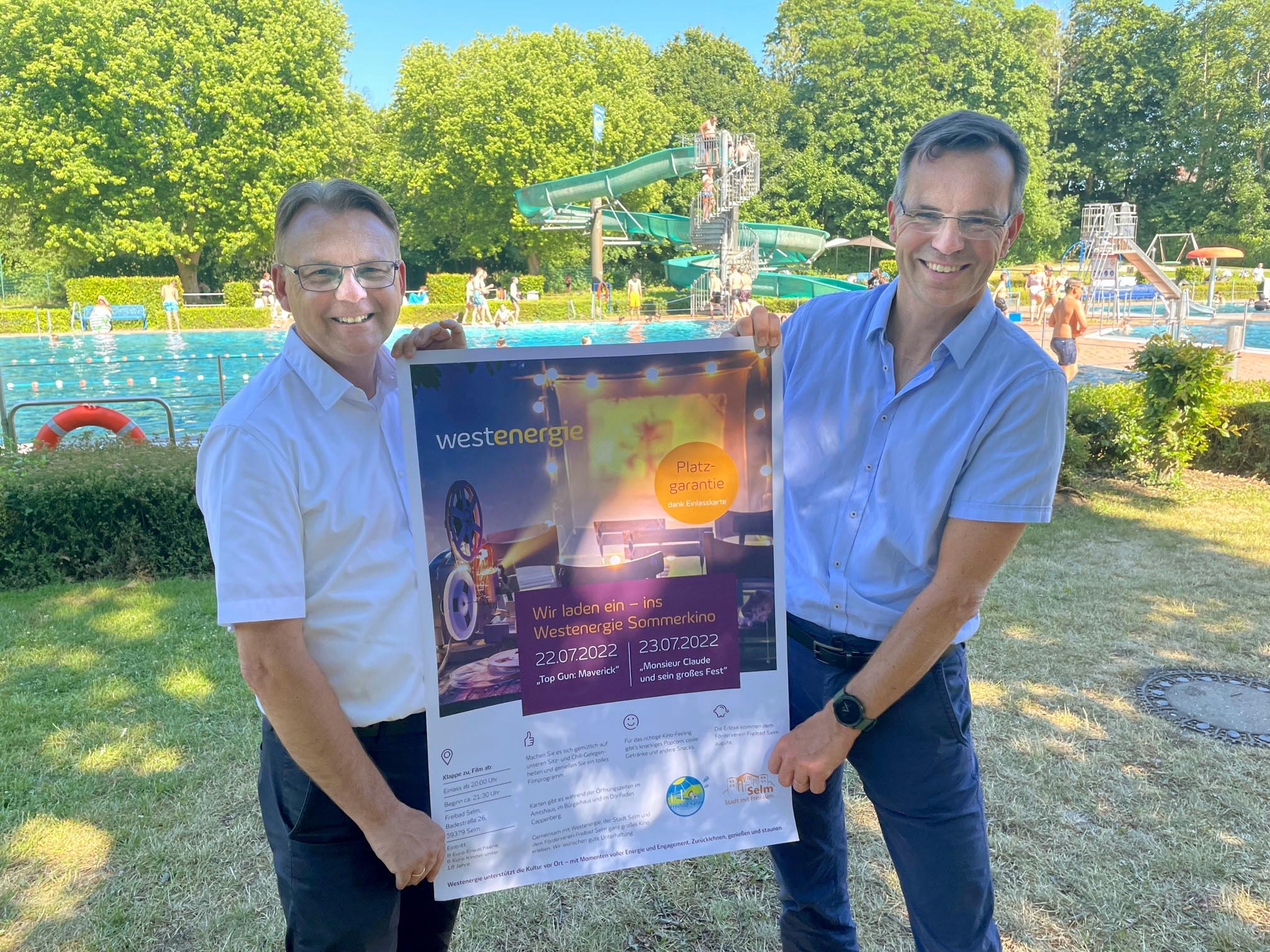 Bürgermeister Thomas Orlowski (l.) und der Geschäftsführer der Bürgerfreibad Selm gGmbH Markus Jungeilges freuen sich auf das Open-Air-Kino im Freibad.
