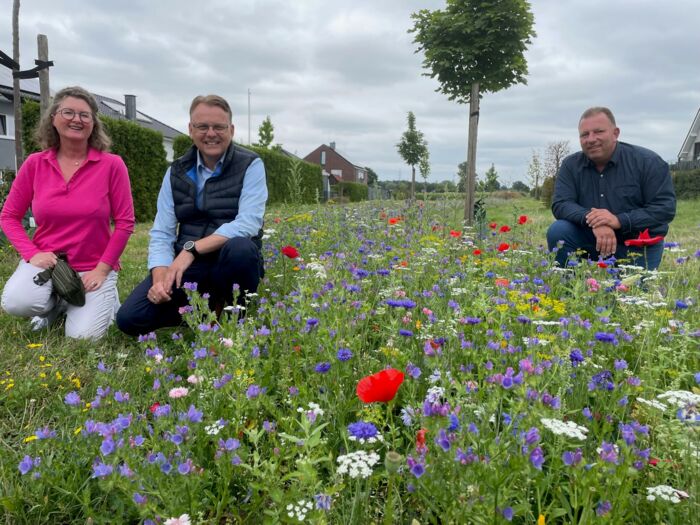 Die Idee zur Pflanzung des Blühstreifens am Klockenberg kam dazu von einer direkten Anwohnerin. Andrea Soodmann hatte sich im vergangenen Jahr mit dem Wunsch, auf dem großen Grünstreifen eine Blühwiese anzupflanzen, an den Bürgermeister gewandt. „Jetzt, wo alles so toll blüht, ist das wirklich ein tolles Bild“, betonte Andrea Soodmann vor Ort. Auf einer Länge von fast 100 Metern hatten die Stadtwerke zwei Kilogramm Saatmischung ausgebracht. Blumen wie Steppensalbei, Wiesenscharfgarbe oder Johanniskraut bieten nun ein buntes Bild.