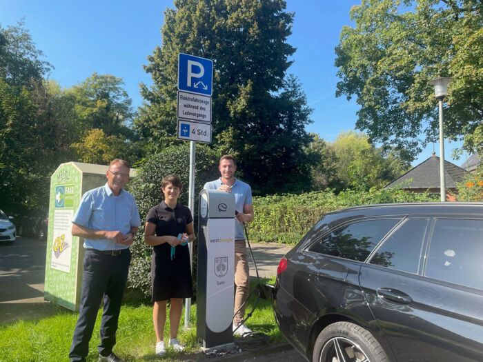 Die Stadt Selm treibt schon seit einiger Zeit den Ausbau der Ladeinfrastruktur für E-Autos in Selm voran. Nun ist eine weitere Ladesäule an einem zentralen Standort in Betrieb gegangen. Bürgermeister Thomas Orlowski, die städtische Klimaschutzbeauftragte Britta Purfürst sowie Westenergie Kommunalmanager Markus Droste überzeugten sich vor Ort von der Freischaltung der Ladesäule.
