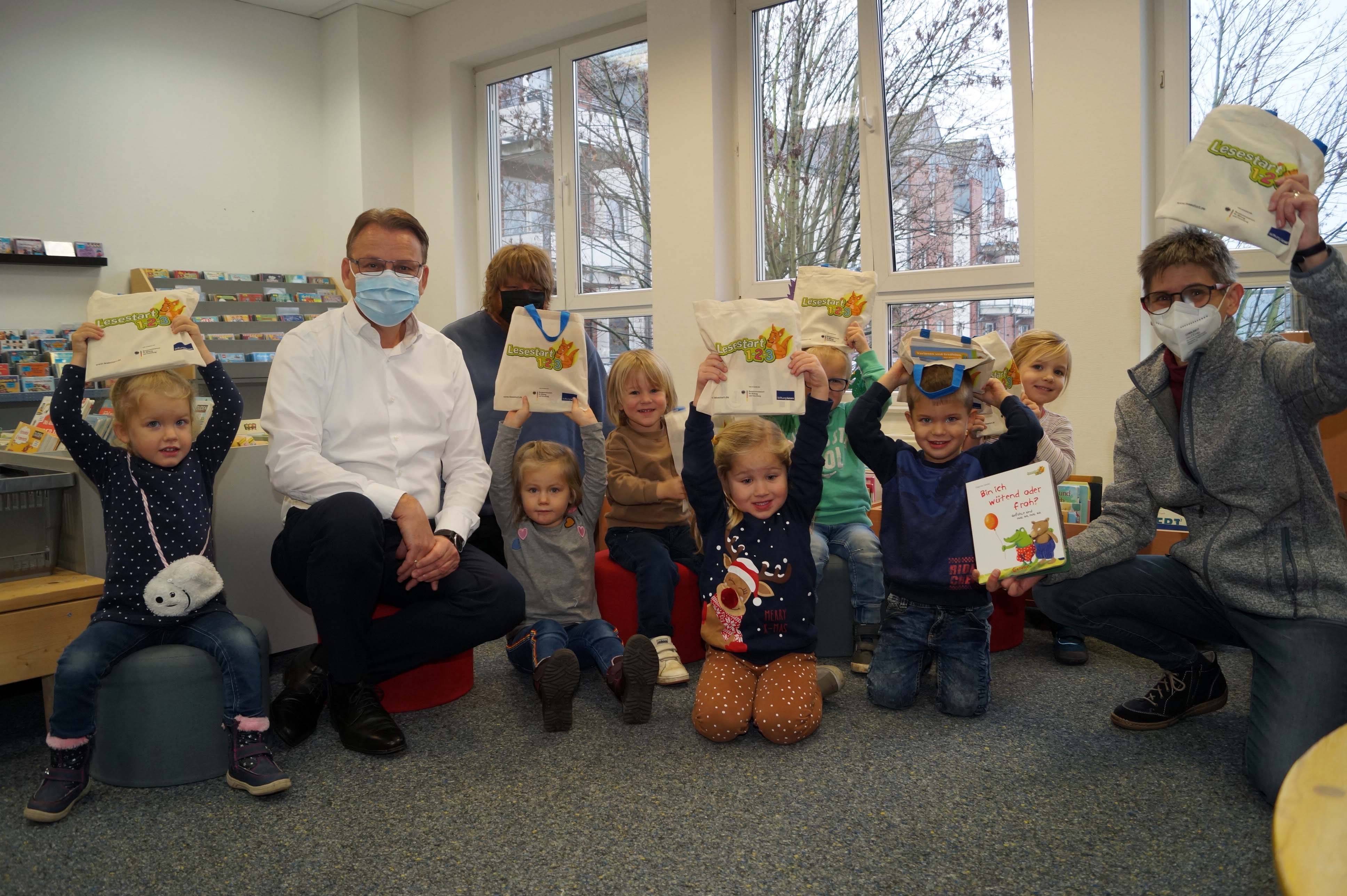 Die ersten Taschen haben am Dienstag Kinder aus der Tageseinrichtung St. Josef bekommen. Gemeinsam mit Leiterin Nicole Kemmler und Betreuer Dirk Bast lauschten die Kinder zunächst der Geschichte der kleinen Raupe Nimmersatt, ehe Bürgermeister Thomas Orlowski die Stofftaschen verteilte. „Ich würde mich freuen, wenn viele Eltern für ihre Kinder eine Tasche in der BIB abholen. Lesen und Vorlesen ist für den späteren Bildungsweg enorm wichtig, daher kann man nicht früh genug damit anfangen“, sagt Bürgermeister Thomas Orlowski.