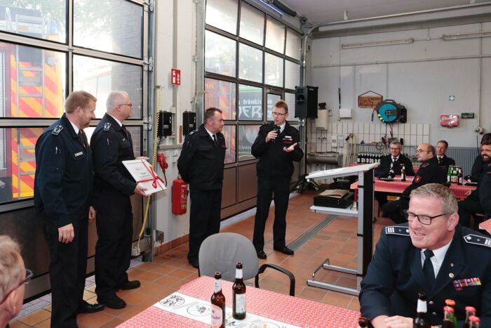 Stadtbrandinspektor Thomas Isermann würdigte die Verdienste von Martin Hüls. „Du bist ein Macher und warst dir nie zu schade mit anzupacken.“ Auch abseits der Feuerwehr habe der ehemalige Bergmann Spuren hinterlassen, wie Isermann berichtete. „Du bist der einzige stellvertretende Leiter einer Feuerwehr im Kreis Unna, vielleicht auch im Regierungsbezirk, mit einer eigenen Autogrammkarte. Deine Fernsehauftritte im Tatort sind unvergesslich. Es ist immer interessant deinen Geschichten und Anekdoten zu lauschen.“