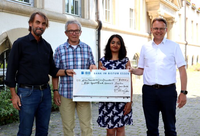 Im März richtete der Pater in Cappenberg rund um das Schloss den zweiten Gottfried-Marathon aus. Ein „Heimspiel“ gewissermaßen, da die Familie Breer aus Langern sich schon immer der Gemeinde St. Johannes Cappenberg verbunden fühlte. Viele Läufer aus der Region gingen über die verschiedenen Strecken an den Start, unter anderem Bürgermeister Thomas Orlowski. 5000 Euro an Spendengeldern waren damals zusammengekommen. 1500 davon gingen an das Trommelzauberprojekt des Kindergartens St. Johannes. 3500 Euro überreichten Pater Tobias und Bürgermeister Thomas Orlowski nun an Manfred Kalix vom Arbeitskreis Asyl Bork und Alina Manjal vom Kreissportbund Unna.