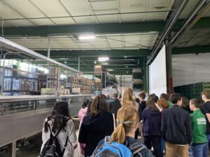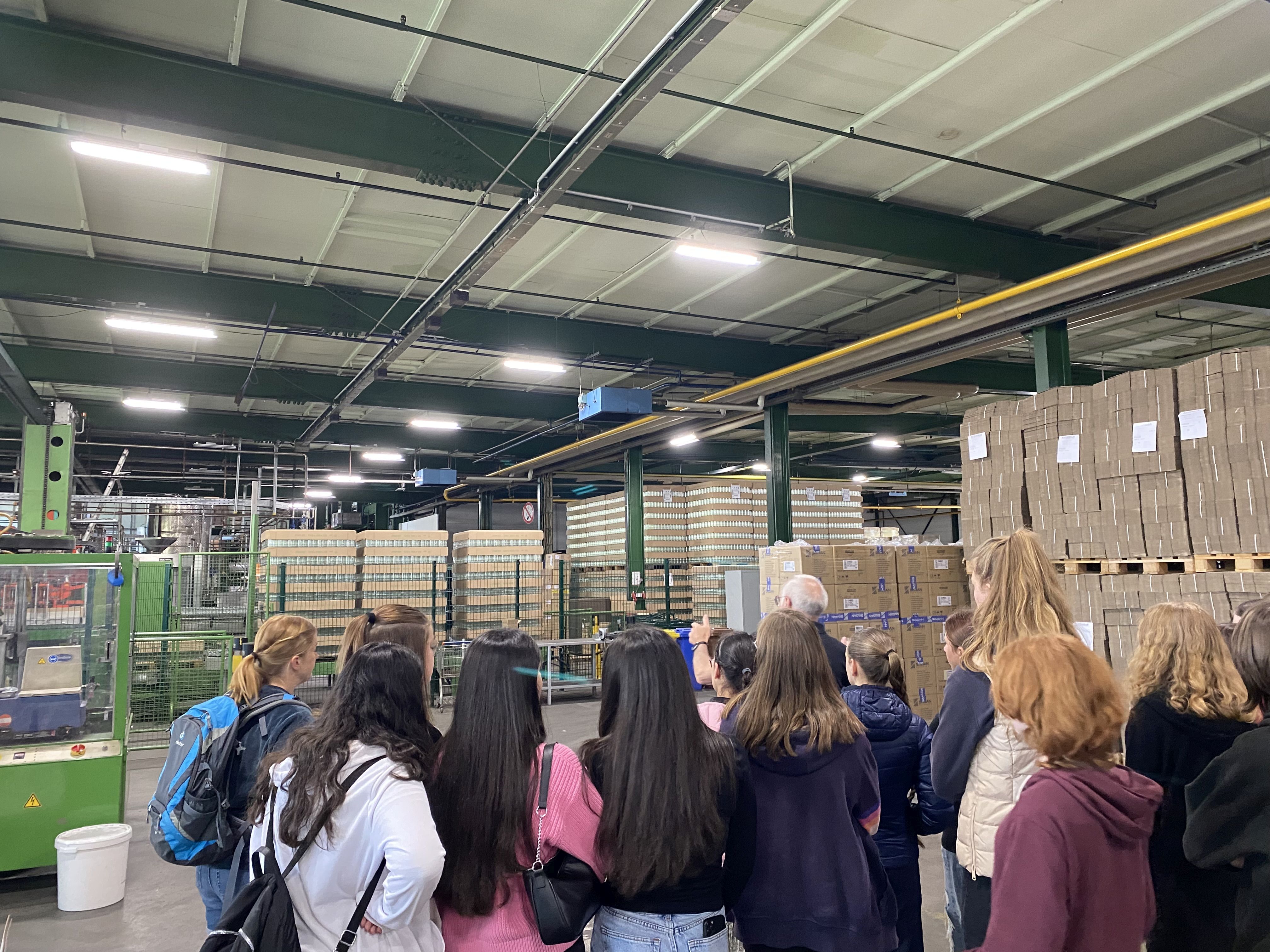 Nach einem Frühstück konnten die Schüler jeweils den Betrieb an der Bahnhofstraße besichtigen und die Abfüll- und Verpackungslinien sowie die Backstraße ansehen. „Die Kartonverpackungen werden vom nahegelegenen Unternehmen Klingle und die Glasflaschen vom Glashaus in Lünen geliefert. Kanne achtet auf kurze Transportwege und verwertet alle Rohstoffe, sodass keine Abfallprodukte entstehen. Seit über 40 Jahren steht bei dem Unternehmen die biologische Erzeugung ohne chemische Zugaben in Fokus. Auch weitere Aspekte wie die Umstellung des Fuhrparks auf Elektromobilität, der Ausbau der bereits vorhandenen PV-Anlagen sowie die Investition in einen Energiespeicher und ein zweites Windrad zeigen, wie sich Kanne in Richtung Nachhaltigkeit und Klimaschutz aufstellt“, zählt Britta Purfürst auf, welche ressourcenschonenden Arbeitsschritte vor Ort unternommen werden.