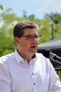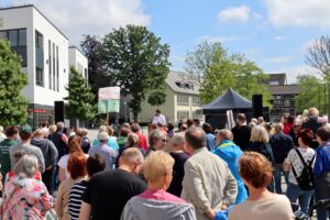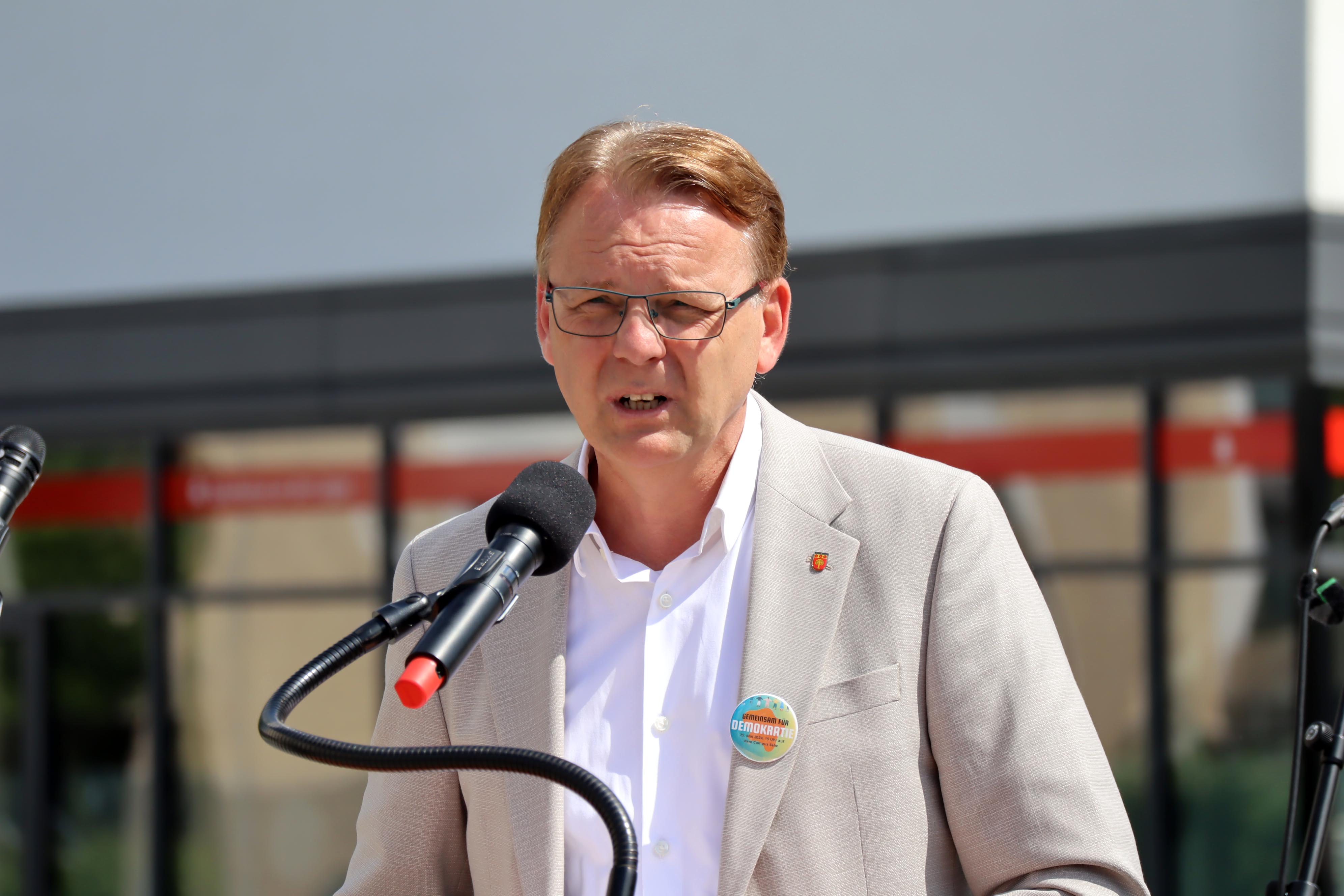 Dass die größte Gefahr für die Demokratie aktuell von rechts drohe, das machte Bürgermeister Thomas Orlowski deutlich. „Angriffe auf Politiker gleich welcher Partei haben in den vergangenen Monaten zugenommen, auch wenn dieses Phänomen nicht neu ist“, so Orlowski. „Wir müssen daher gemeinsam für die Demokratie einstehen und die Stimme erheben“, führte der Bürgermeister weiter aus und erinnerte an das Inkrafttreten des Grundgesetzes vor 75 Jahren. „Das Grundgesetz ermöglich es uns, diese Veranstaltung durchzuführen. Wir müssen dankbar sein, dass Freiheit und Demokratie durch das Grundgesetz für uns selbstverständlich ist.“ Trotzdem dürfe man die Demokratie nicht als selbstverständlich erachten sondern müsse sich auch für sie einsetzen. Daher sei die Kundgebung auf dem Campus wichtig gewesen. Er bedankte sich daher bei allen, die zu der Kundgebung gekommen waren bzw. bei den Vereinen und Institutionen, die diese im Vorfeld unterstützt hatten.