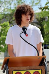 Mit Arsenij Heemann sprach anschließend ein 18-jähriger Schüler des Städtischen Gymnasiums und gab der jungen Generation eine Stimme. „Leider fühlt sich meine Generation nicht beachtet von Politikern und Entscheidungsträgern“, gab er zu bedenken. Das hänge unter anderem damit zusammen, dass die Politik meist nicht dort stattfindet, wo sich junge Menschen informieren, in den Sozialen Medien zum Beispiel. Er persönlich und viele seiner Mitschüler würden den Diskurs mit der Politik wünschen. „Ja vielleicht auch sogar mit der AFD, denn wir sind vor allem in der Oberstufe mittlerweile groß und meinungsstark genug, um Nazis Paroli bieten zu können.“