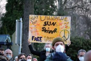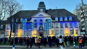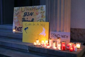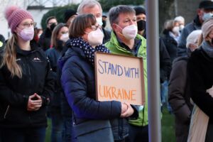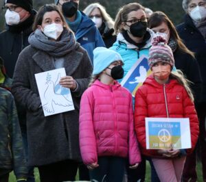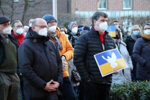 Der stellvertretende Bürgermeister Michael Feige, der für den Rat sprach, ergänzte. „Ein Krieg ist nie eine Lösung von Problemen sondern eine feige Hinterlist, anderen Nationen Leid zuzufügen und zu unterdrücken.“ Er rief daher dazu auf, Flüchtlinge aus der Ukraine, sollten diese weiter vor dem Krieg in ihrer Heimat flüchten, Schutz und Unterkunft zu geben. Das unterstrich Monika Heitmann, die für die Flüchtlingsarbeitskreise sprach. „Mir hat einmal ein Flüchtling gesagt, es ist so toll, hier zu sein, denn hier ist Frieden.“ Ähnlich empfinden jetzt die Menschen, die aus der Ukraine flüchten.
