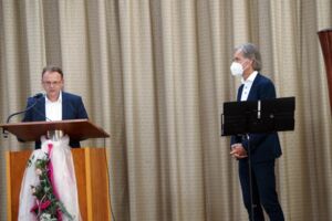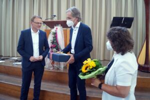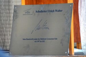 Ulrich Walter dankte anschließend in seiner Rede den vielen Wegbegleitern, die ihn in den vergangenen 24 Jahren am Gymnasium unterstützt hatten. „Ich durfte die Schule im Team prägen und entwickeln“, so Walter. Das Gymnasium sieht er daher für die kommenden Jahre gut in der Schullandschaft aufgestellt. Zwar kehrt er der Schule nun den Rücken, so ganz verlässt er diese aber nicht. Eine Tafel mit seiner Unterschrift wird ab sofort die Ahnengalerie im Städtischen Gymnasium schmücken.