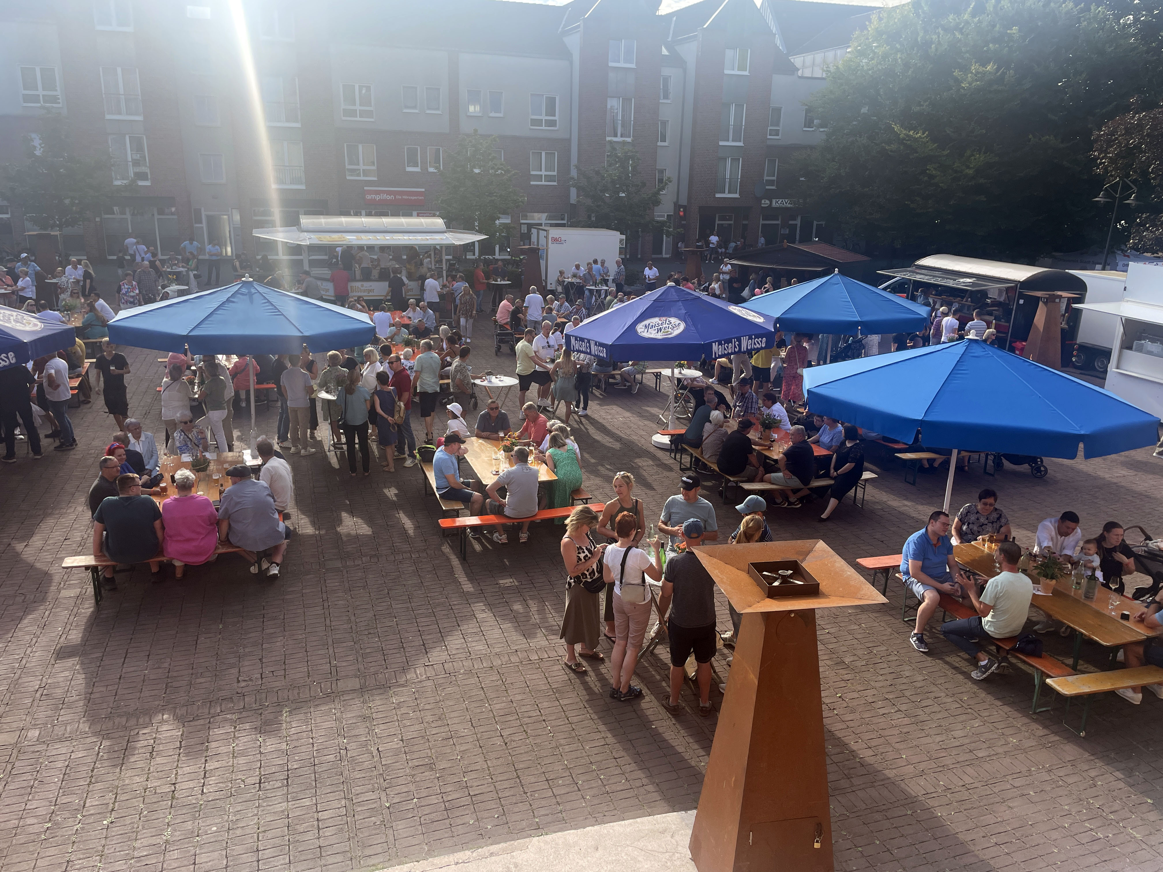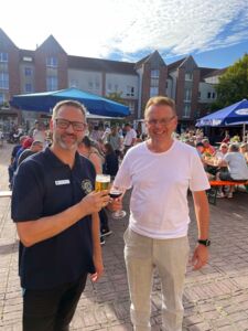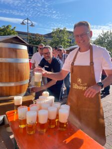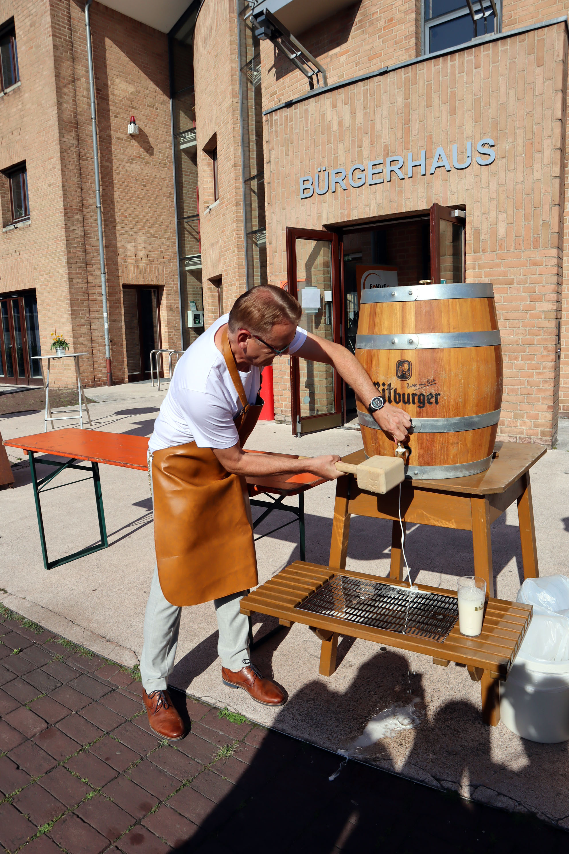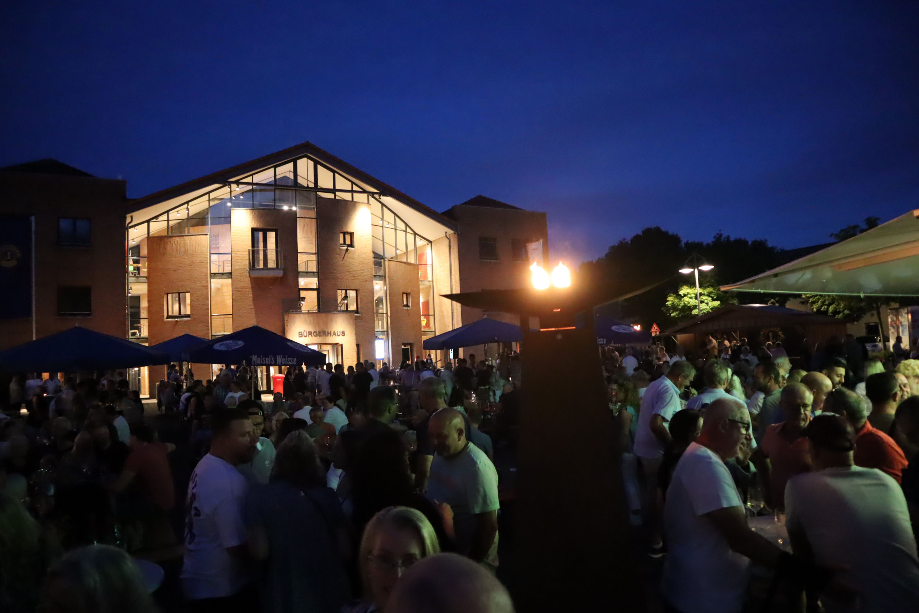 Hervorragendes Wetter, eine Auswahl an leckeren Weinen und Craftbieren, das passende Essen und musikalische Unterhaltung in einem stimmigen Ambiente. Das waren die Zutaten für das gelungene Wein- und Bierfest auf dem Willy-Brandt-Platz. Über 1000 Gäste kamen am Samstag und verbrachten einen geselligen Abend mit Freunden und Bekannten. Bürgermeister Thomas Orlowski nahm um 17.30 Uhr den Fassanstich vor und freute sich, bereits so früh so viele Gäste begrüßen zu können. Mit ein paar Schlägen hatte Orlowski das 50-Liter-Freibierfass, das von der Bitburger Brauerei gesponsort wurde, angeschlagen. Die ersten Gläser des kühlen Gerstensaftes füllten sich schnell.